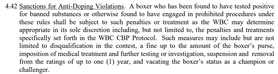 The fact that WBC has no authority to clear or ban any fighter for drug use was something has been clearly illustrated in their rules which delineates the exact authority the sanctioning body has and limits them to only handing out punishments or clearances based on their own organization: